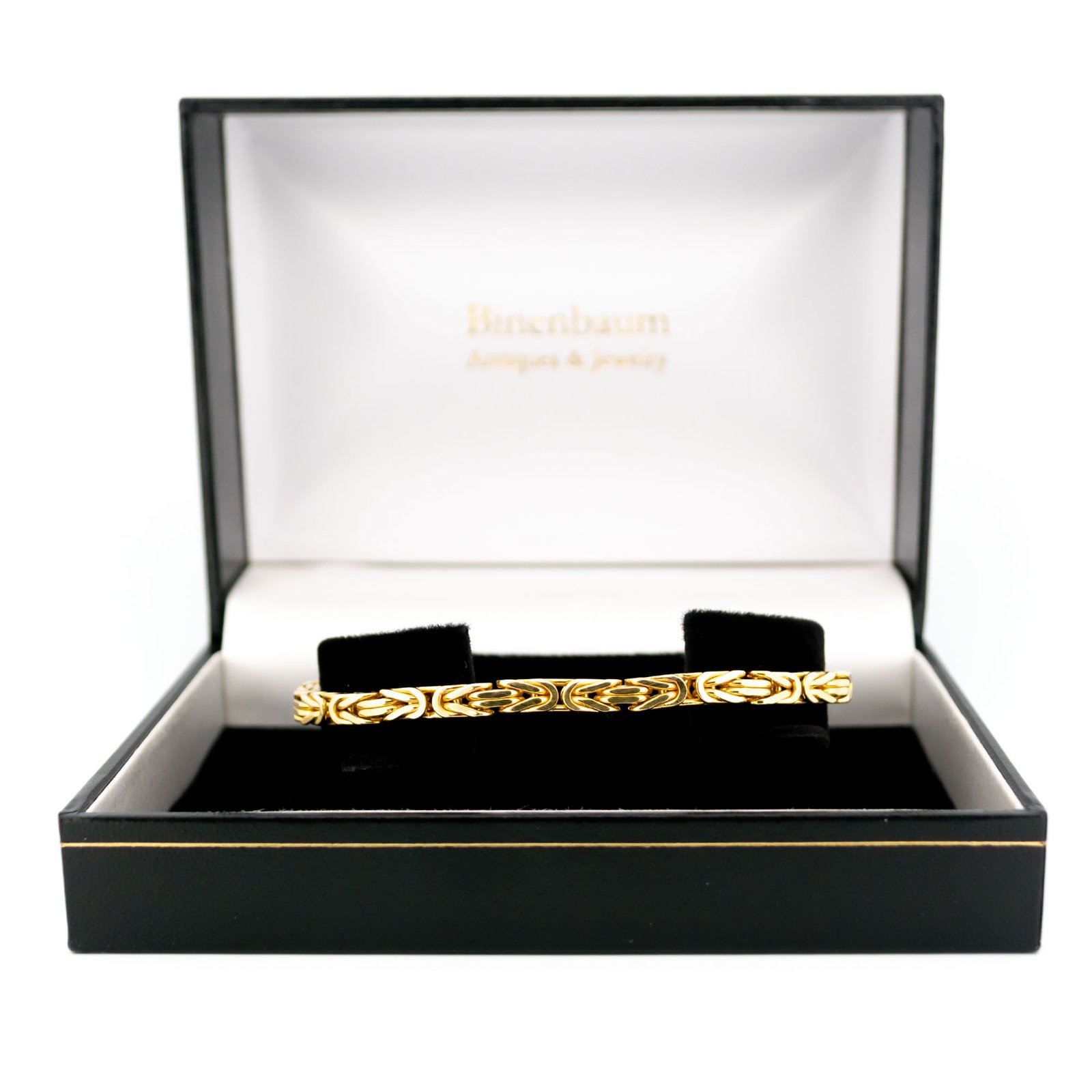 This 14k gold Byzantine bracelet showcases an iconic interlocking pattern, forming a bold yet refined silhouette. The polished finish enhances every curve of the detailed links, catching light from every angle. Smooth to the touch and comfortably weighted, itโ€™s a classic vintage design made to last. ๐Ÿ’›