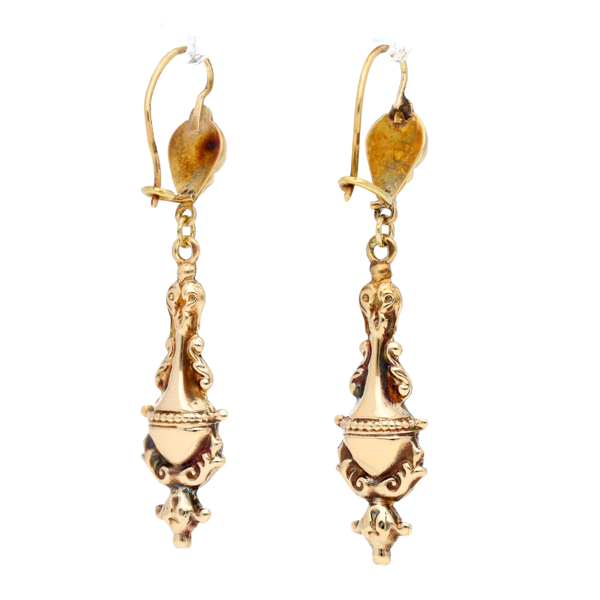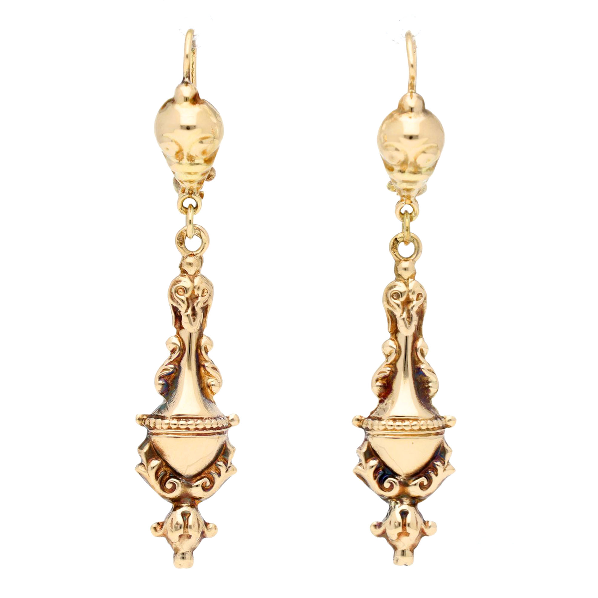 These 14k gold earrings feature an elegant drop design with embossed detailing and curved, ornamental lines. The rounded top transitions into a tapered, decorative body, creating a balanced, fluid look. Their polished finish reflects light beautifully, adding a soft glow to any outfit. Dutch assay mark 585.