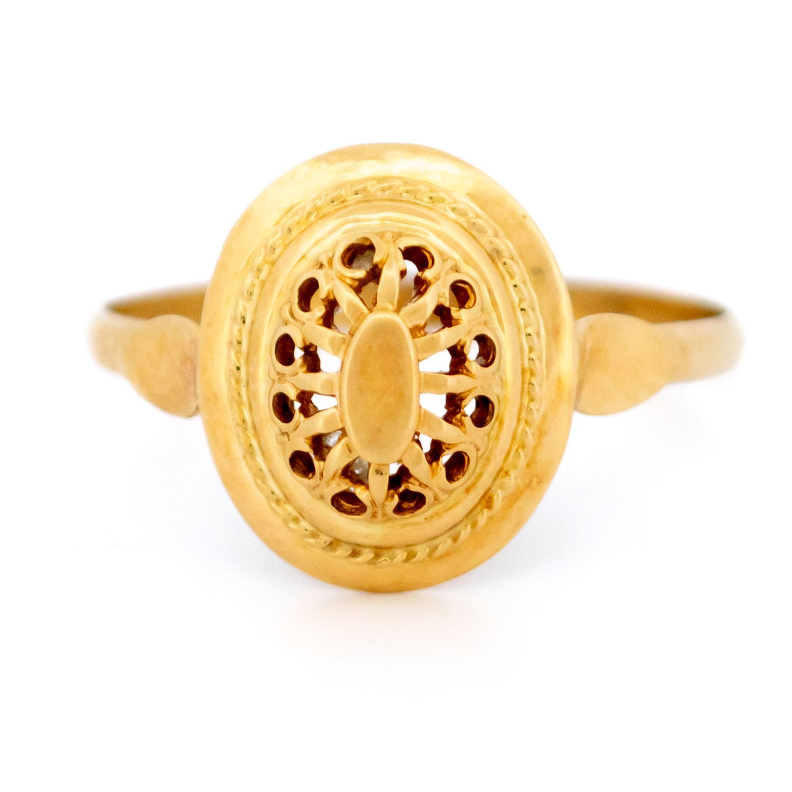 A warm 14k gold ring with a graceful vintage soul. The oval top features delicate openwork filigree, forming a light, lace-like pattern around a smooth oval center plate. A subtle rope border frames the design, adding texture and depth. The softly brushed gold finish and slender band create a refined look that feels both timeless and distinctive. ✨