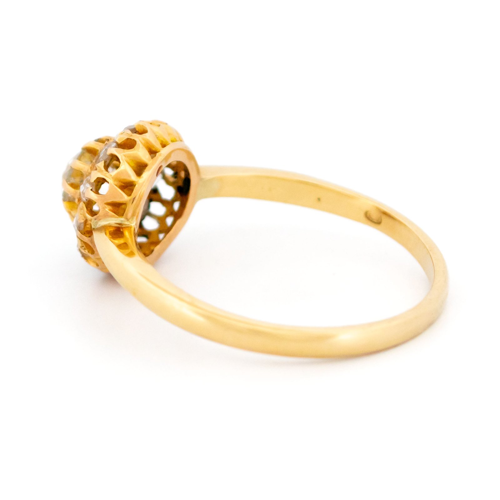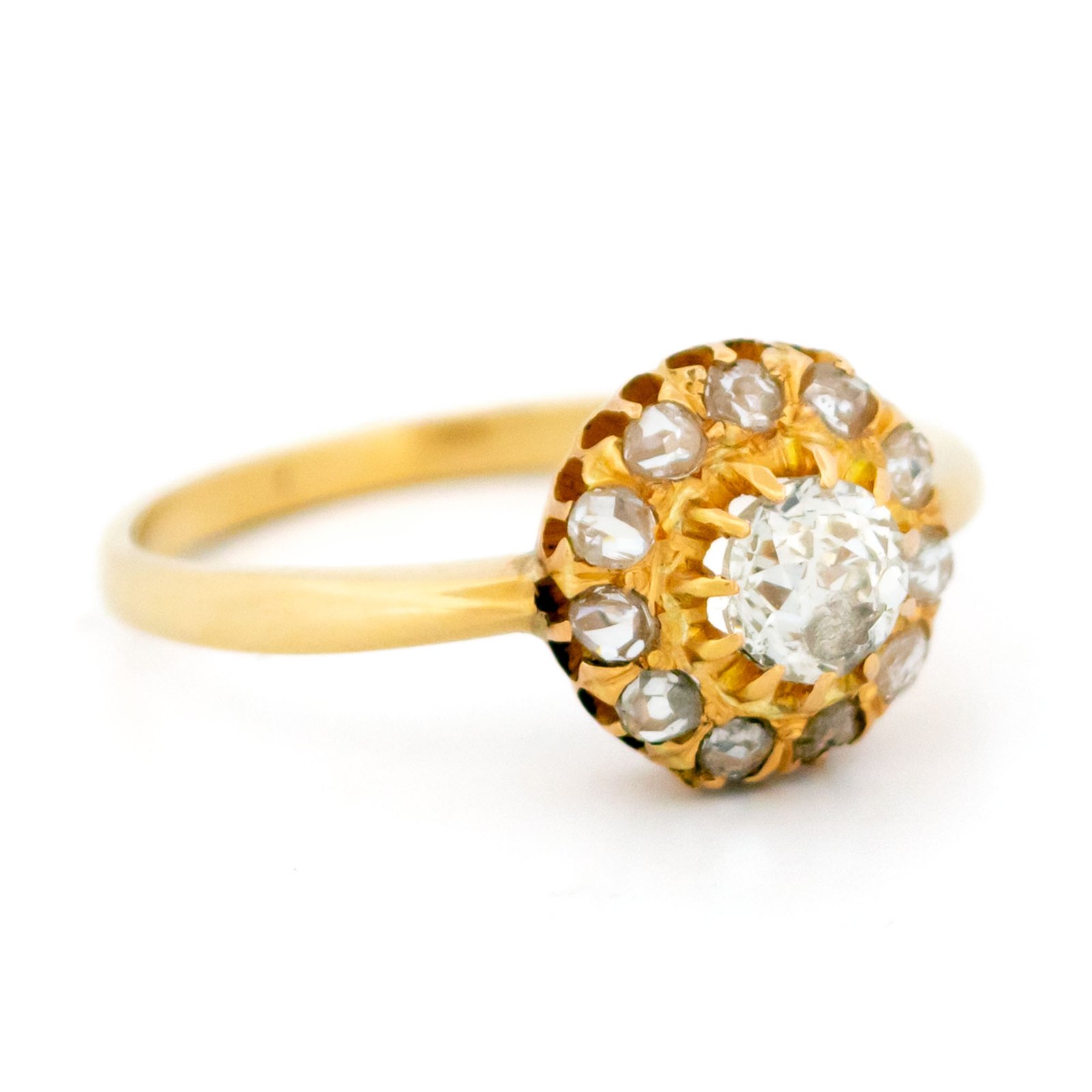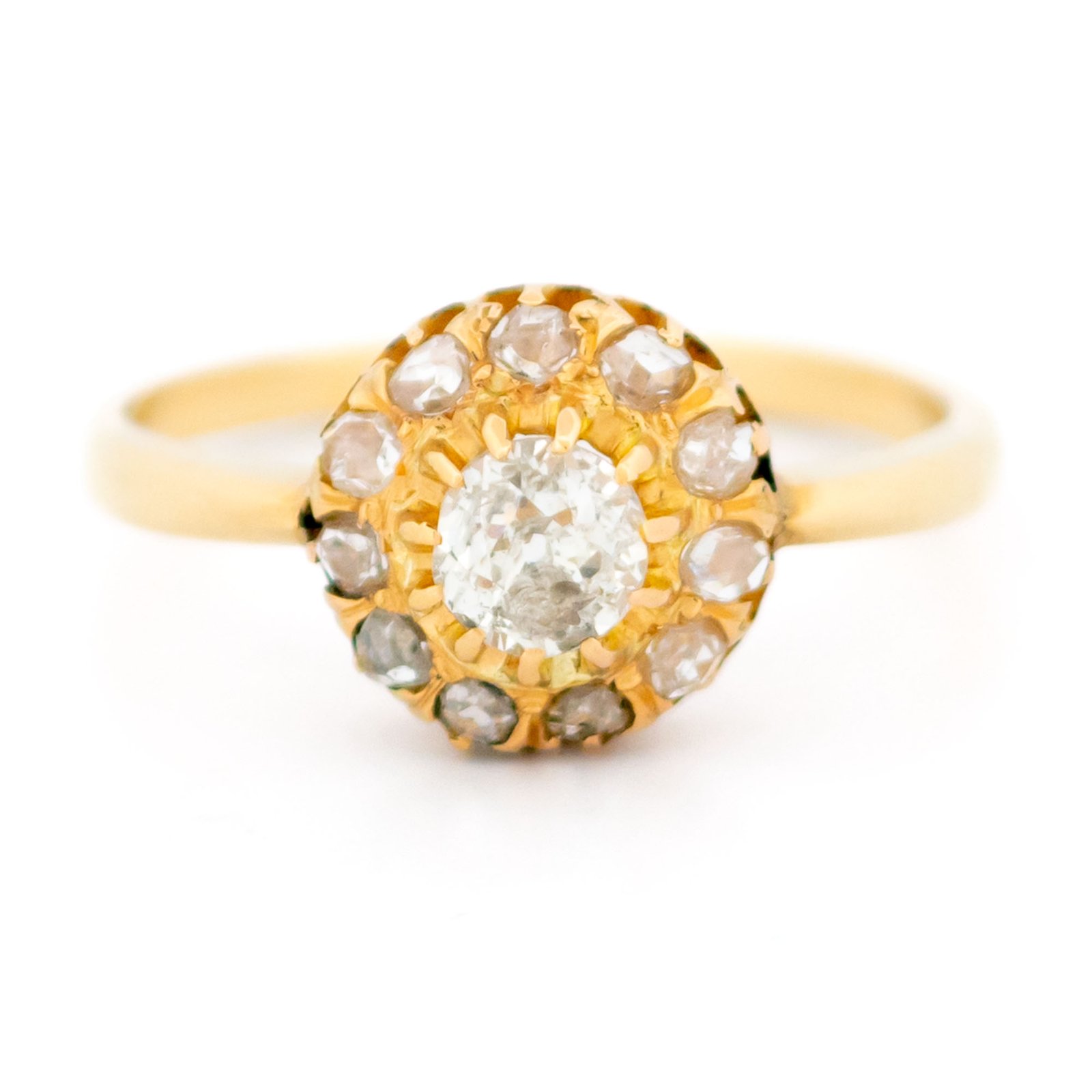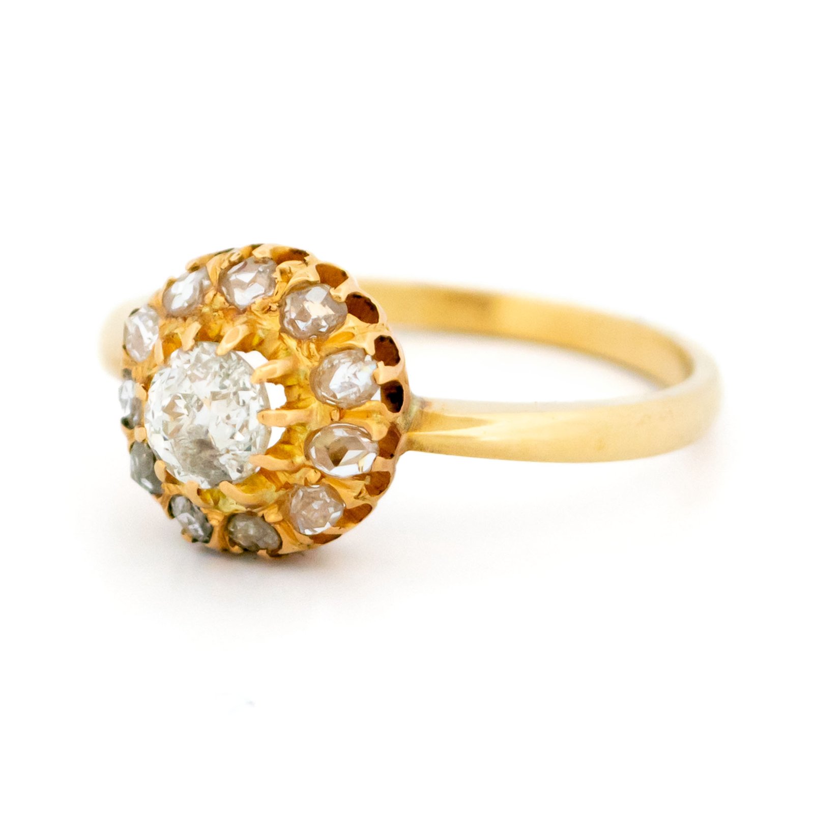 A graceful antique cluster ring centered with an approx. 0.40ct old-mine-cut diamond, showing gentle warmth and natural character. A halo of approx. 0.15ct rose-cut diamonds adds a soft, candlelit shimmer. Crafted in rich 14k yellow gold, the openwork setting highlights fine vintage craftsmanship ✨ A refined piece with quiet presence.