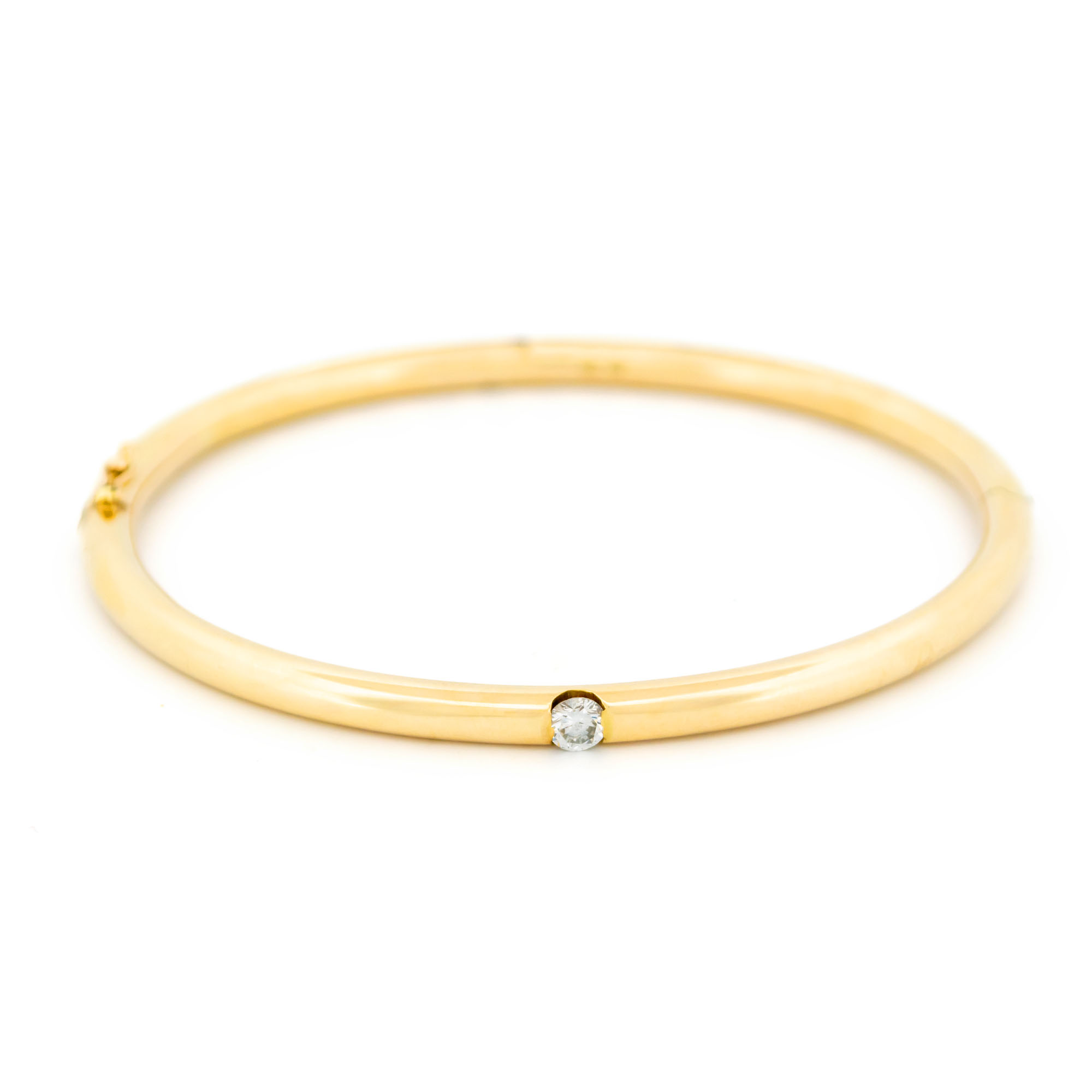 A classic vintage bangle crafted in solid 14k yellow gold, weighing approx. 30 grams. Set with a brilliant-cut diamond (approx. 0.23 ct, G VS1), discreetly flush-set for subtle sparkle. The smooth, solid form feels reassuringly substantial on the wrist ✨ Made by Giezen Metaalbewerking b.v., Zoeterwoude.