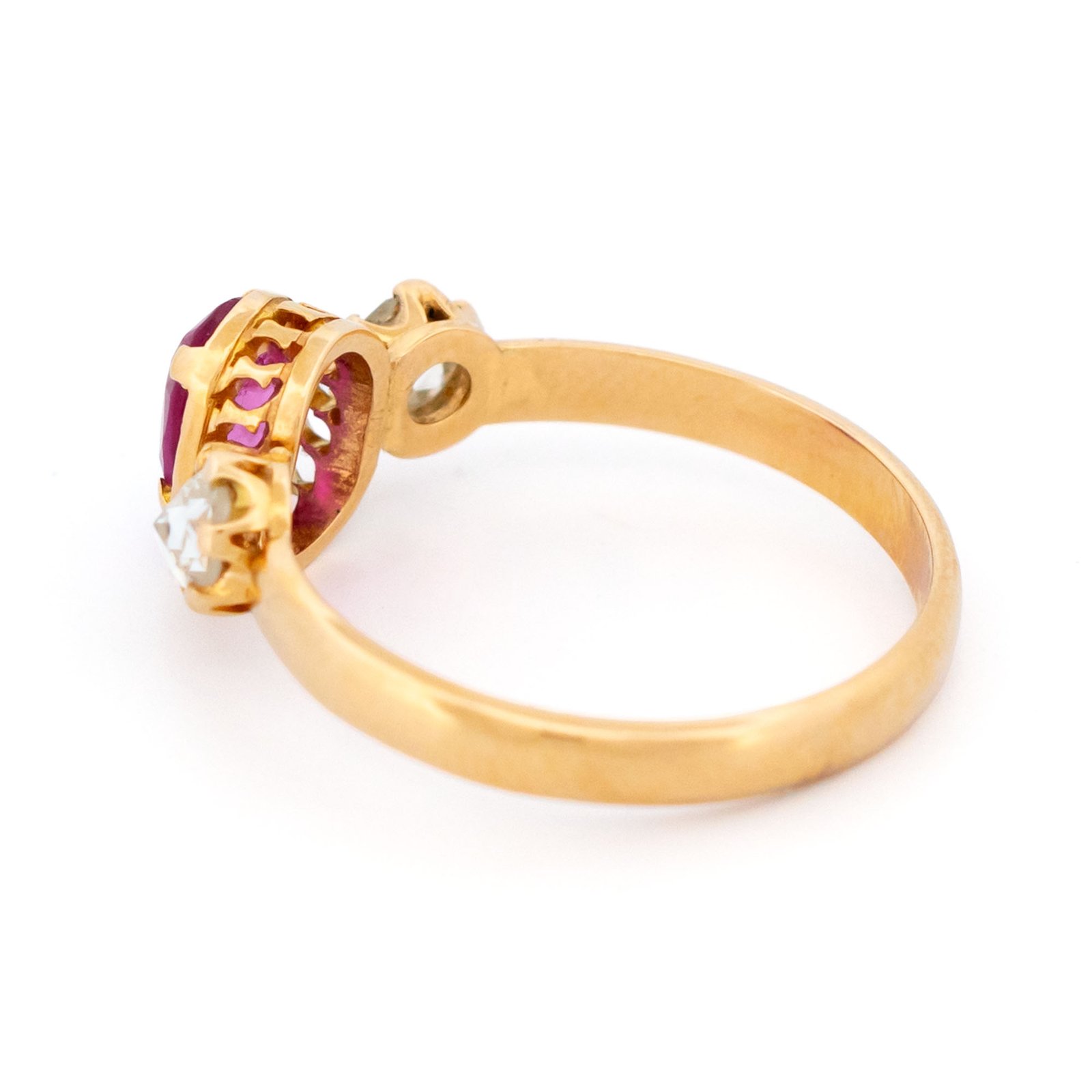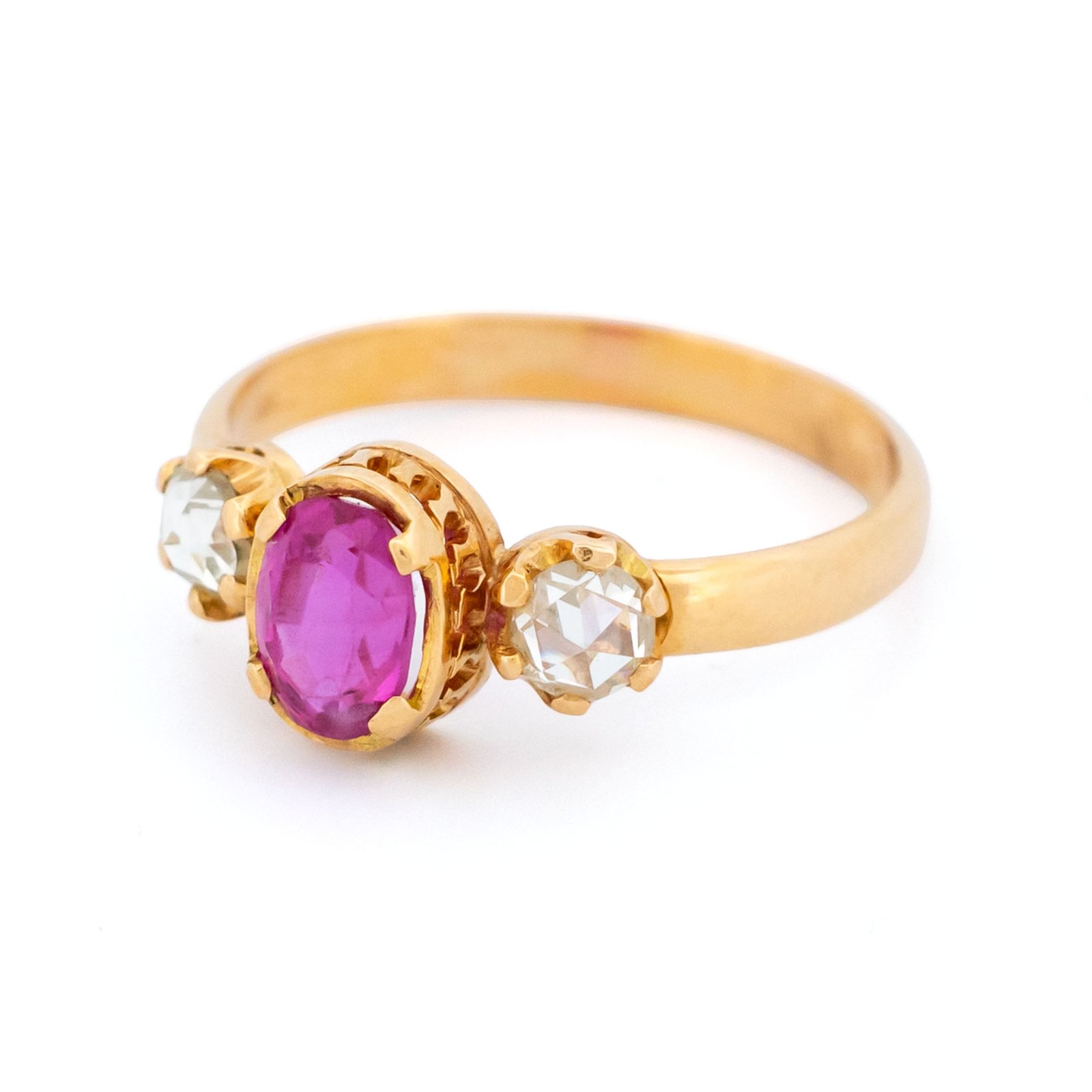 A refined trilogy ring in rich 18k yellow gold, centered with a vivid oval ruby (~1.00ct) glowing in deep pink-red tones ❤️. Flanked by sparkling rose-cut diamonds (~0.40ct), the softly faceted stones catch light with a gentle shimmer, creating a balanced and timeless composition. Dutch assay mark 750.