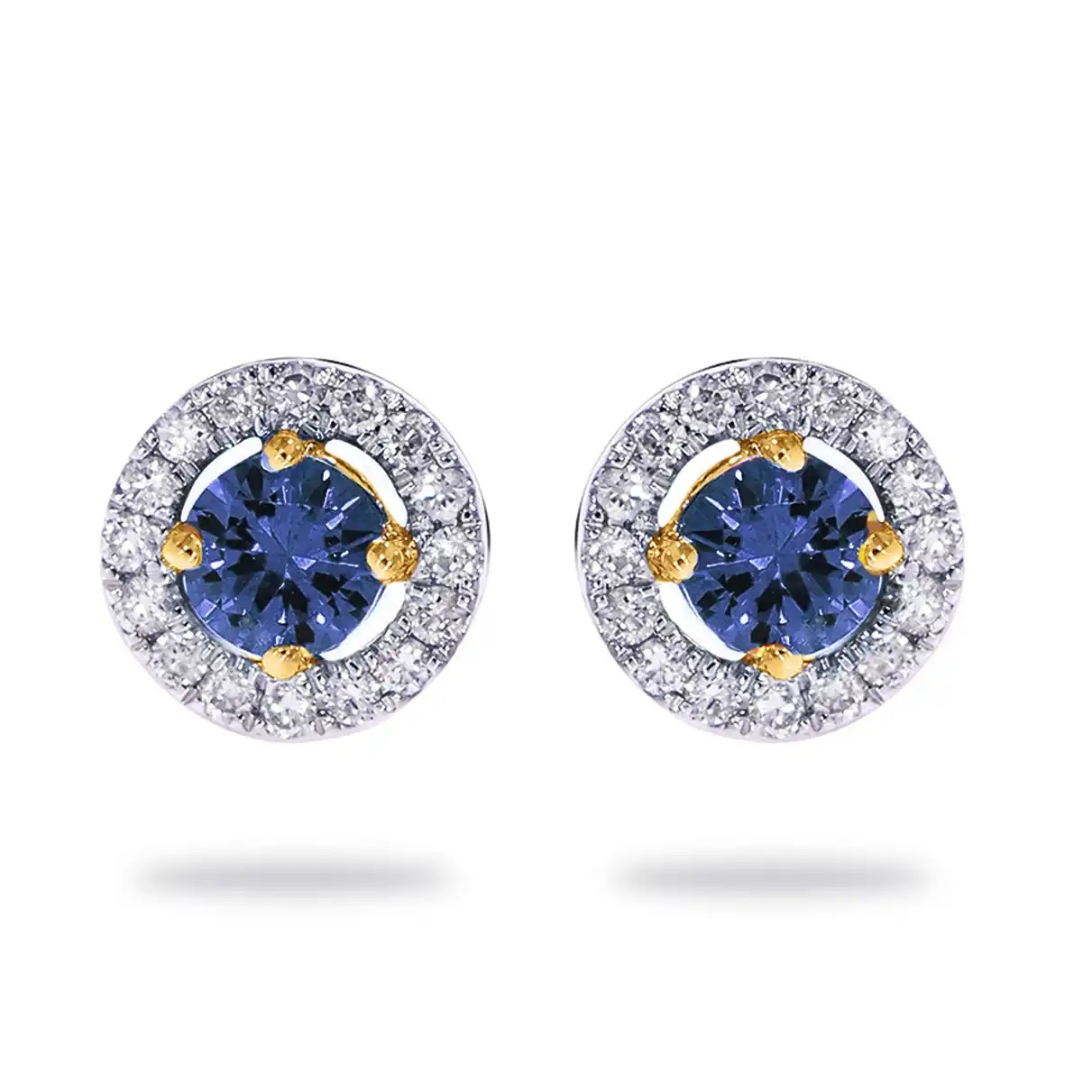 Brilliant blue sapphires (0.26ct) glow at the heart of these halo studs, framed by 0.09ct of dazzling diamonds. Crafted in yellow and white 14k gold, they’re a modern twist on a timeless favorite. 💎💙