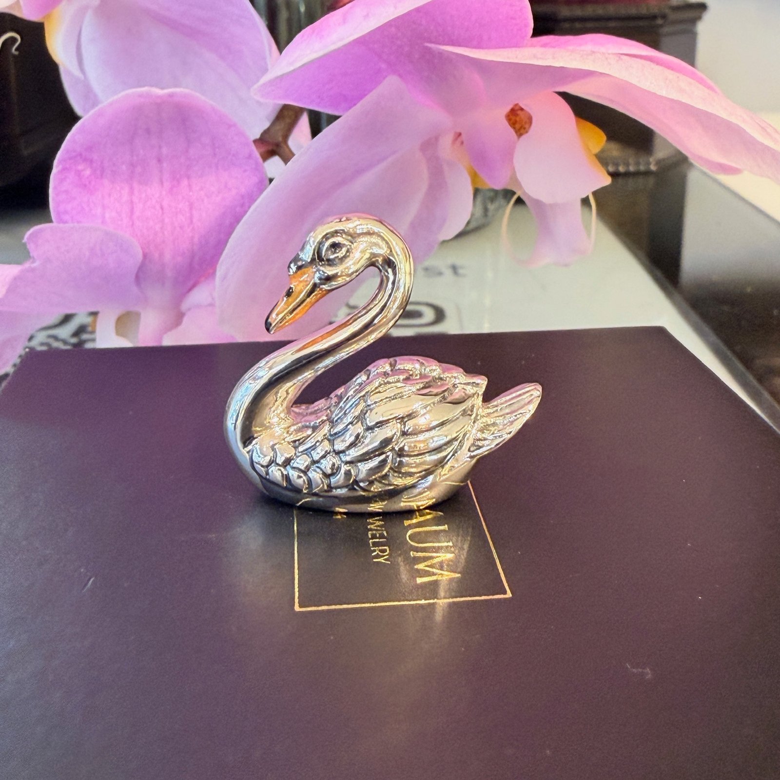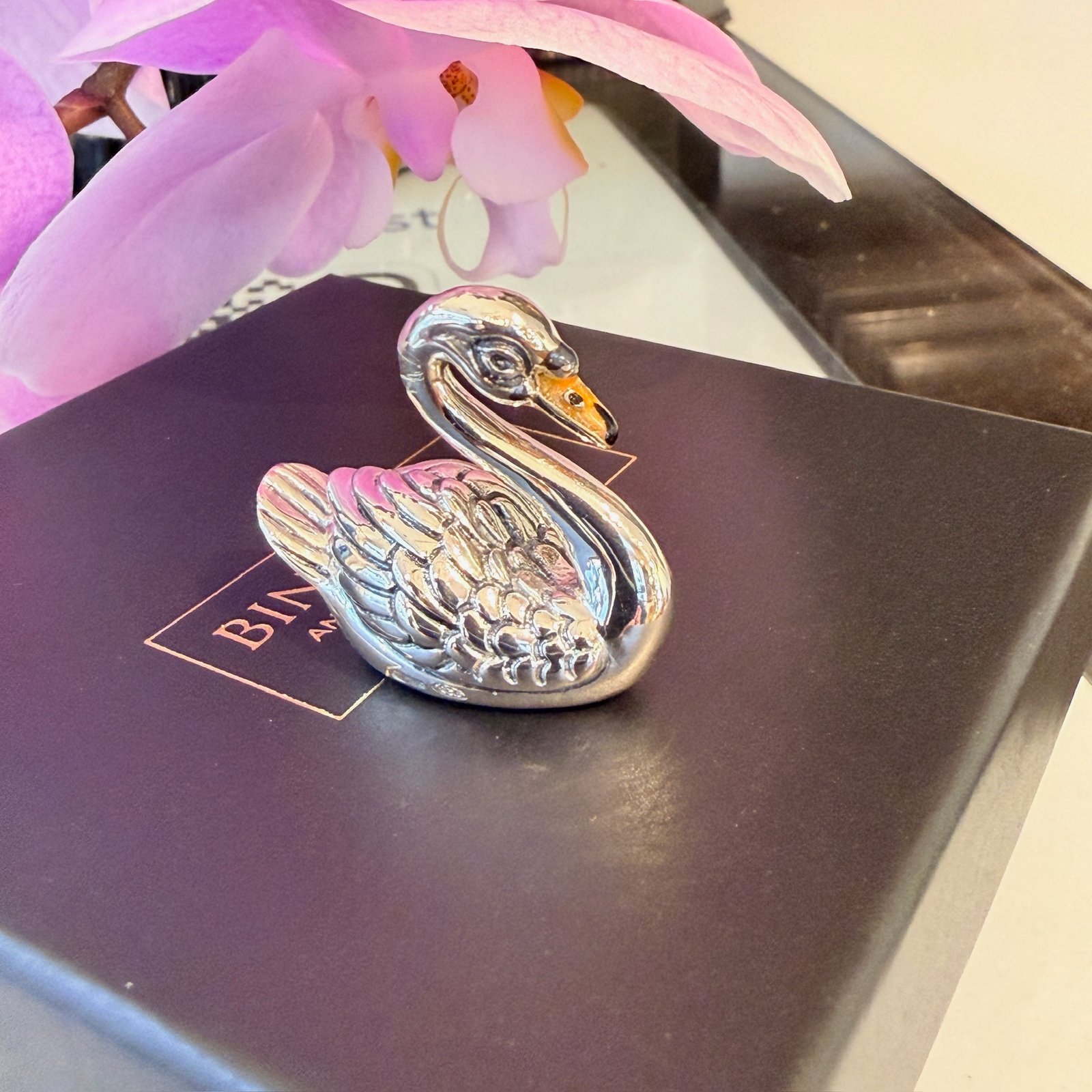 Poised and luminous, this contemporary swan figurine is crafted in 925 sterling silver and refined with delicate enamel accents. The gracefully curved neck flows into intricately sculpted wings, each feather carefully defined for depth and texture. A warm-toned beak adds subtle contrast to the polished silver body. Created by Saturno, Italy, it’s an elegant tribute to nature in fine Italian craftsmanship. 🦢 Saturno, Italy.