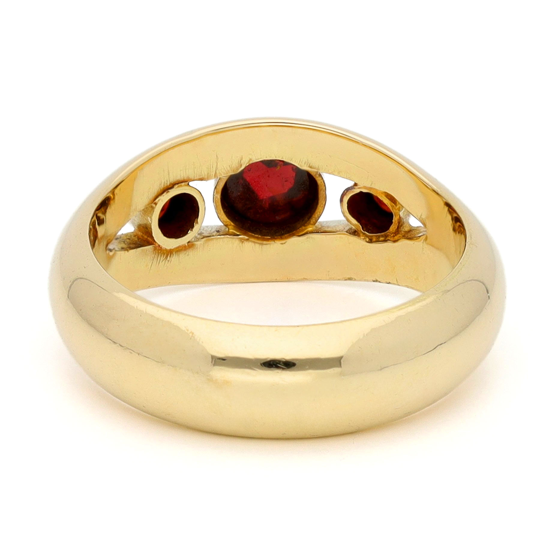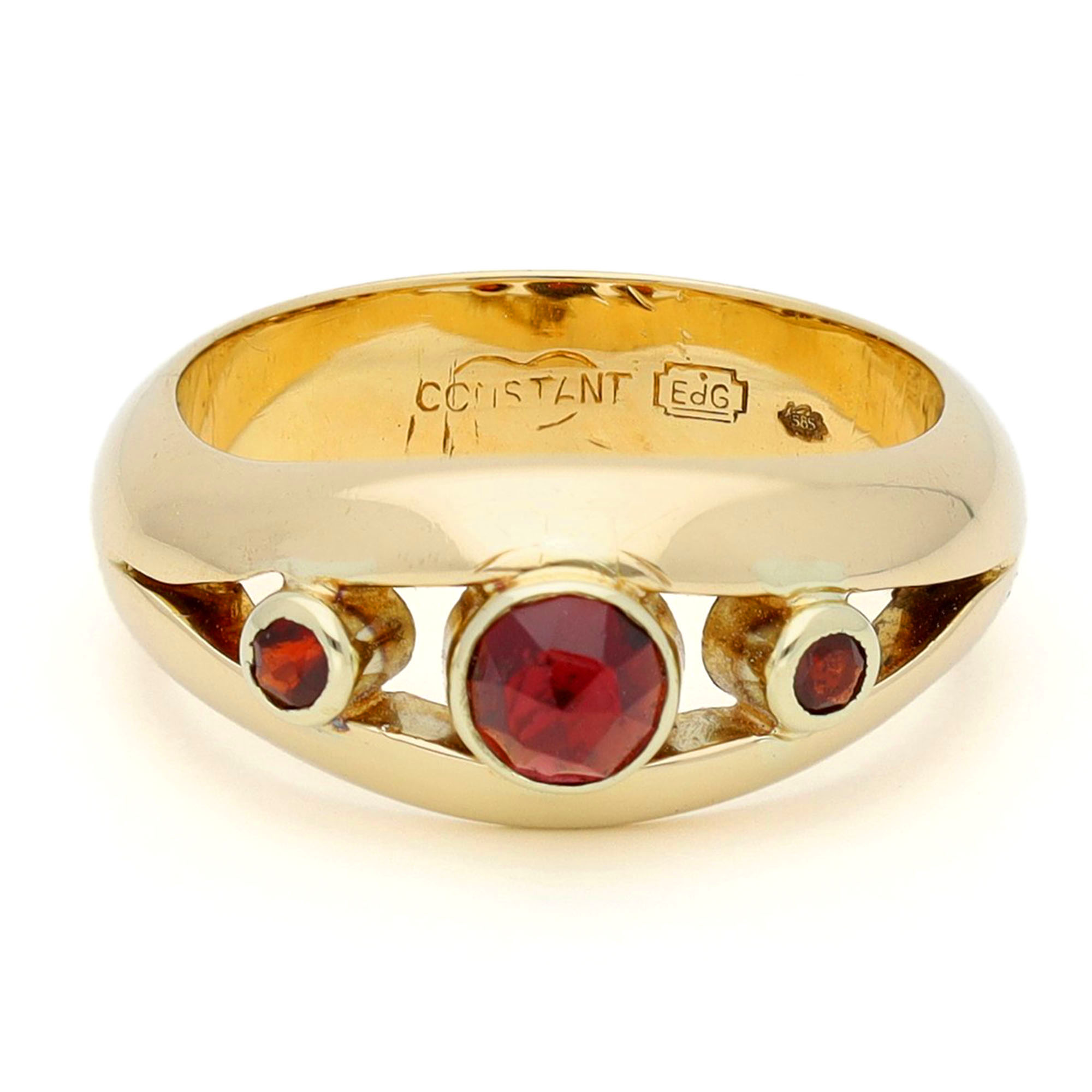 Crafted in polished 14k gold, this trilogy ring features three bezel-set garnets in rich wine-red tones. The gently curved band and open gallery allow light to play through each stone, enhancing their natural depth. A subtle yet distinctive design from the mid-20th century. Dutch assay mark 585.