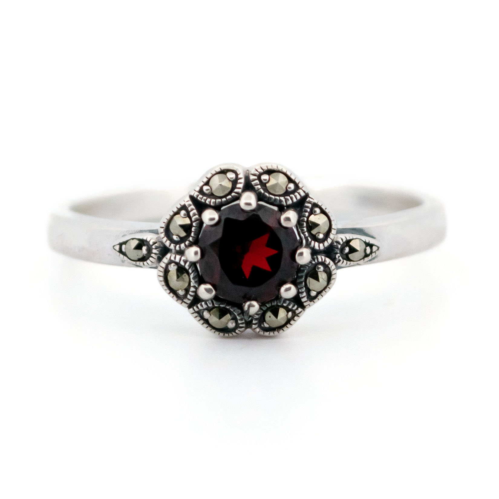 Details: ±0.60ct Garnet, Marcasites (pyrite), 925′ Silver Ring.