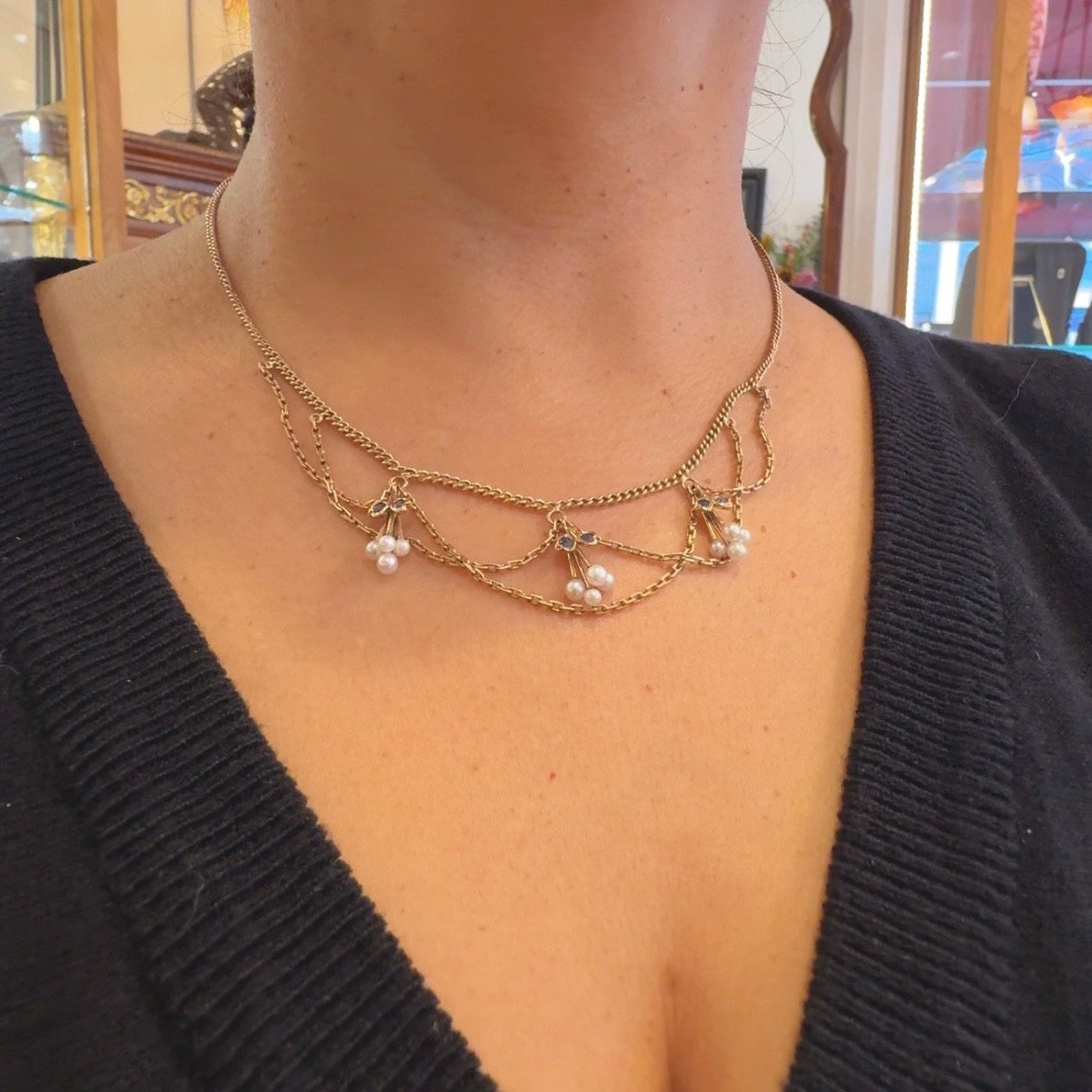 A graceful Dutch ca.1900 festoon necklace, crafted in 14k gold, drapes elegantly with clusters of 2.5β3 mm pearls accented by delicate blue sapphires (β0.15ct). A refined piece of antique charm with timeless beauty. πΏπ