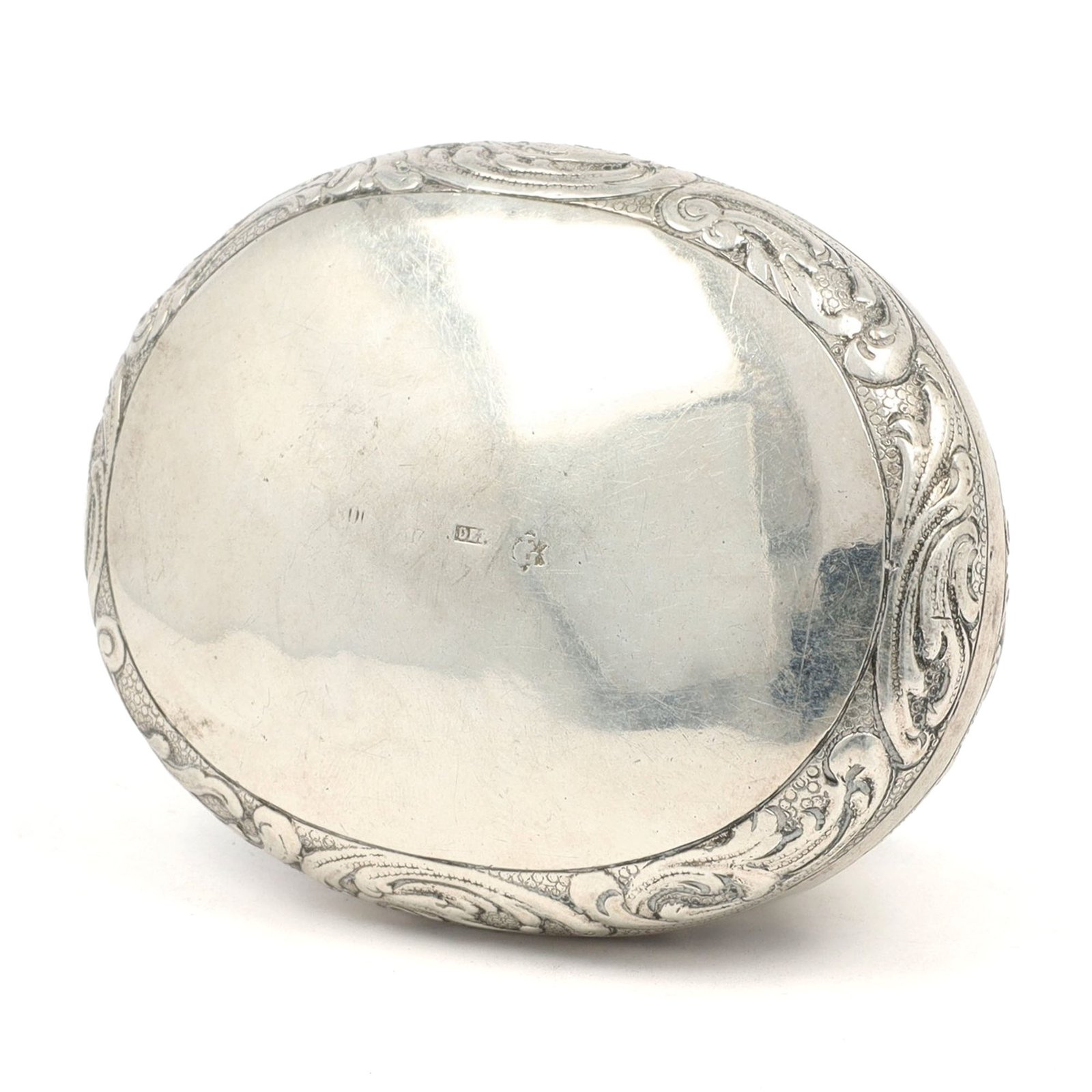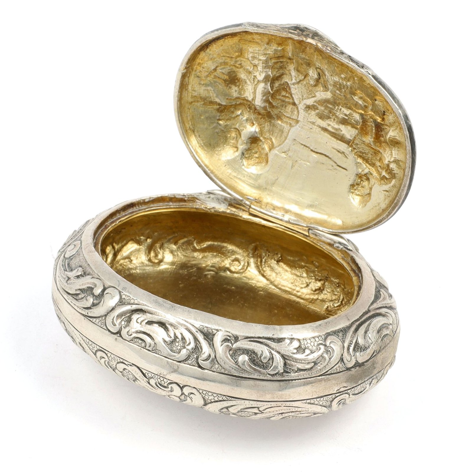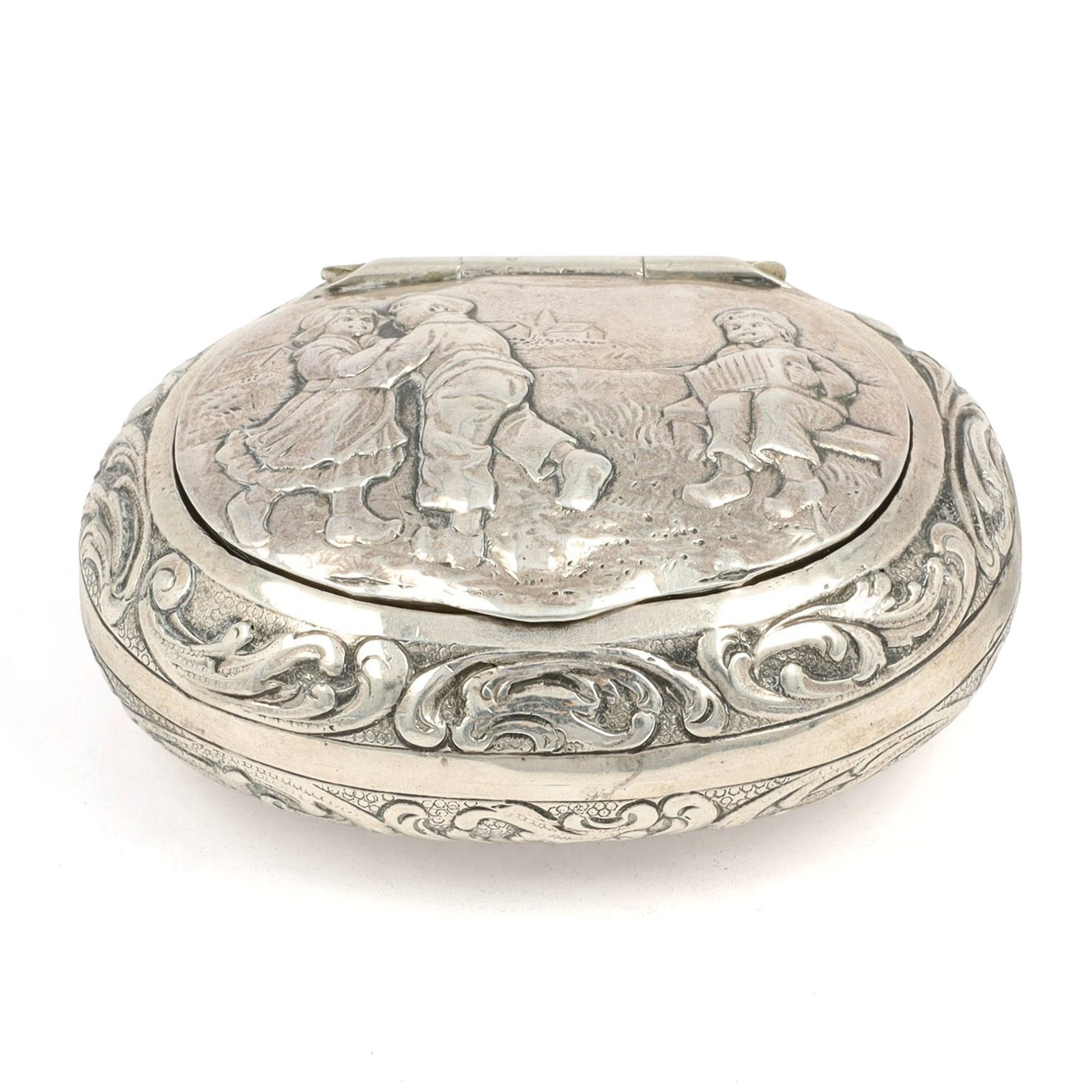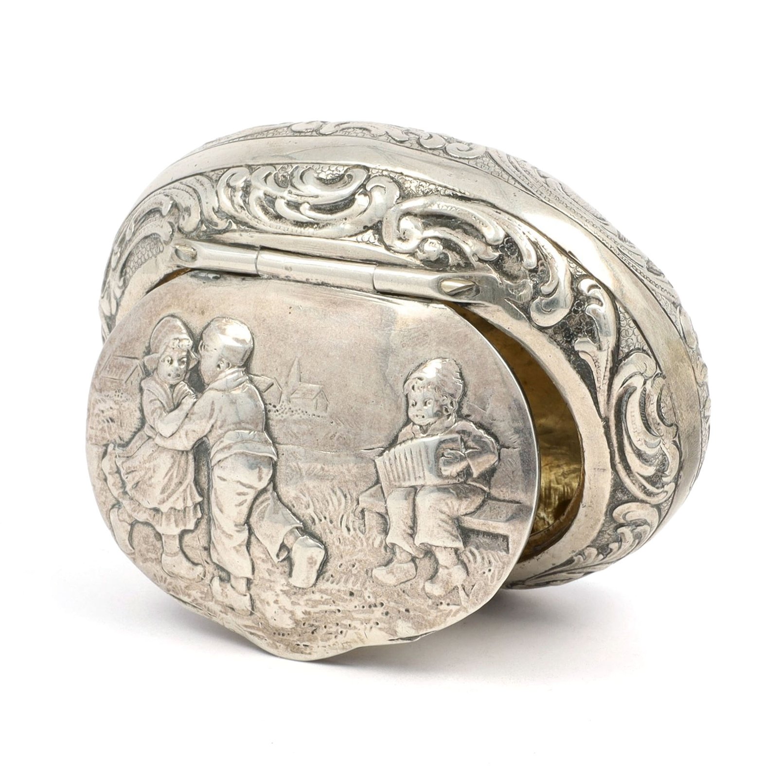 An antique silver box by Jacob Grimminger, richly adorned with repoussé and chased scrollwork 🌿 The lid reveals a charming pastoral scene in soft relief, while the warm gilt interior adds a subtle golden glow. Crafted in 800 silver, this piece blends decorative detail with refined, functional beauty.